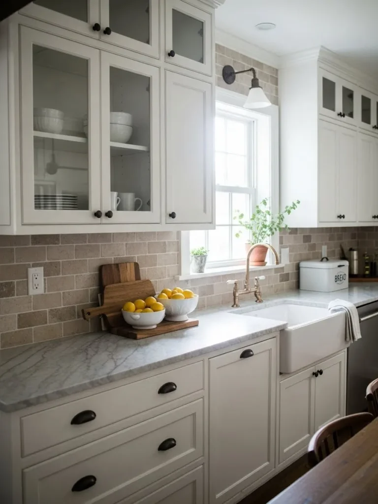 This kitchen feels like the kind of space where slow mornings and homemade muffins just make sense. The creamy white cabinetry keeps everything bright and airy, while the soft beige brick backsplash adds a lovely layer of cozy texture. I love how the glass-front uppers showcase simple white dishes that give the room that effortlessly styled farmhouse look. The marble countertop brings in a gentle sophistication, and the apron-front sink paired with the warm brass faucet is such a pretty nod to traditional farmhouse design. Even that little bowl of lemons looks like it belongs here, adding a fresh pop of color against all the warm neutrals.