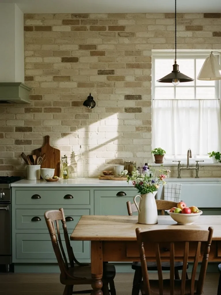 This kitchen feels like the kind of space where mornings are slow and sweet. The soft beige brick backsplash brings in a warm earthy texture that instantly makes the room feel grounded and welcoming. Paired with those lovely sage green cabinets and dark cup pulls, the whole setup gives off a perfectly balanced rustic yet polished vibe. The farmhouse sink, simple pendant lighting, and touches of natural wood around the room tie everything together in that cozy old-meets-new way. Even the sunlight hitting the brick adds its own little magic, almost like the room is showing off on purpose.