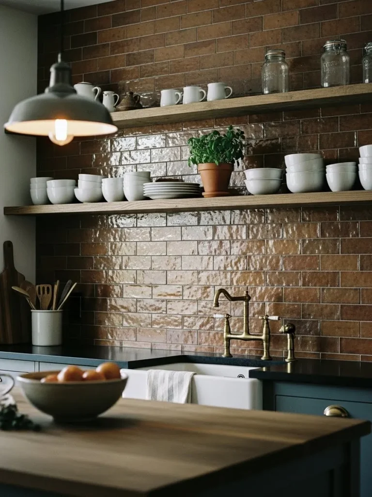 This kitchen brings such a lovely sense of warmth with its glossy clay toned brick backsplash that instantly feels rich and inviting. The brick has that beautiful handmade texture that catches the light in the softest way, giving the whole wall a gentle shimmer. Paired with simple wooden open shelves filled with white ceramics, everything feels balanced and effortlessly homey. The farmhouse sink and old world inspired brass faucet add a touch of vintage charm, while the dark countertops ground the space with a little modern contrast.