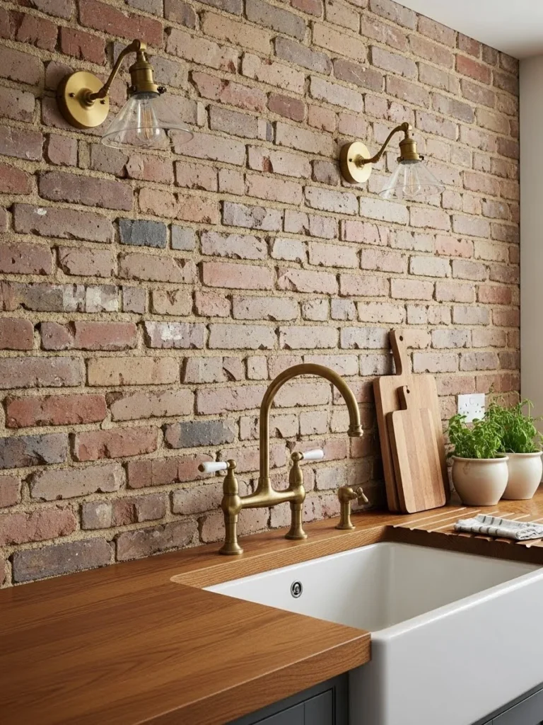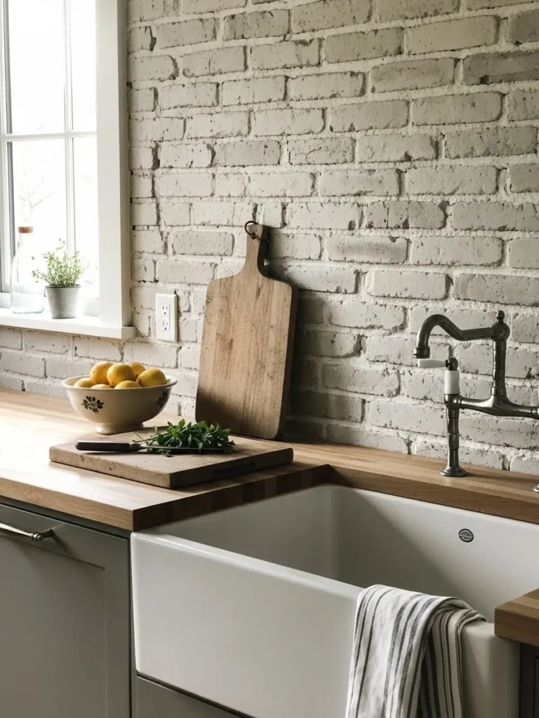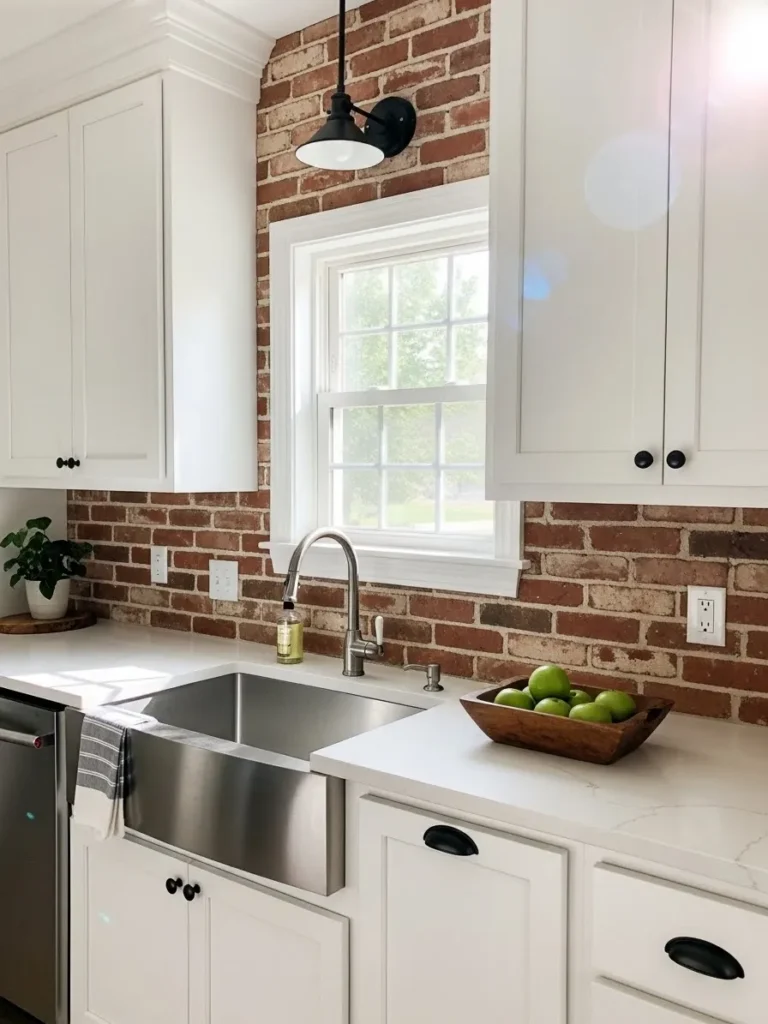 Rustic Brick Backsplash with Cozy Farmhouse Charm