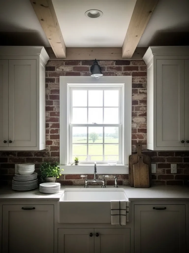 This kitchen brings together such a warm and grounded farmhouse look with its red brick backsplash framing a bright white apron front sink. The soft cream cabinetry keeps everything feeling calm and airy while the exposed wooden ceiling beams add that perfect touch of rustic character. I love how the window sits right above the sink and lets in all that countryside light. The simple black sconce, stacked dishes, and a pair of well loved wooden cutting boards give the whole space a lived in feeling that feels both charming and polished at the same time.