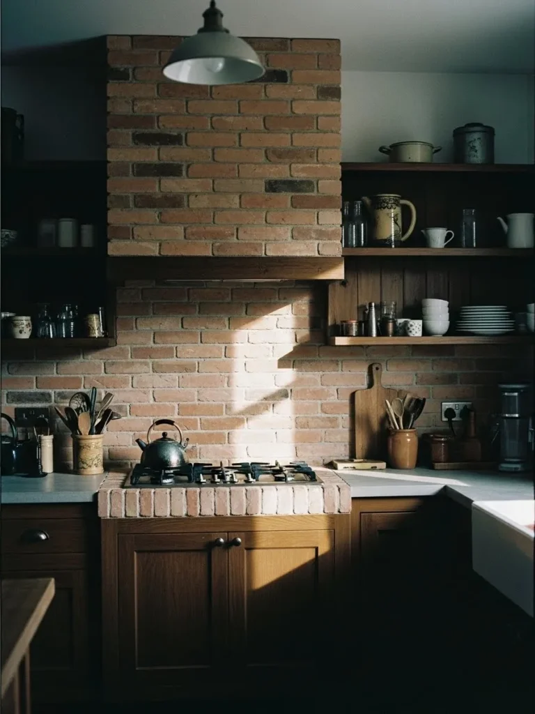 This kitchen brings all the cozy farmhouse charm with its gorgeous brick surround that stretches from the backsplash to the range hood. The soft reddish brick sets a warm and earthy tone that blends beautifully with the deep wood cabinetry and open shelves. I love how the bricks frame the stovetop as if the cooking area is its own little rustic nook. The simple pendant light, the well loved kettle, and the mix of ceramic and glass pieces on the shelves make the whole space feel collected and genuinely lived in. Natural light falling across the brick adds even more texture, making every surface feel warm and inviting.