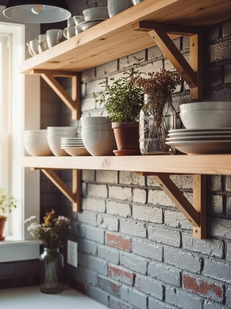 This kitchen brings together the coziest parts of farmhouse style with a soft brick backsplash that instantly makes the whole space feel grounded and inviting. The muted gray bricks have just a hint of rustic red peeking through, giving them that perfectly lived in look. Paired with simple wooden open shelves, the space feels relaxed and practical in the sweetest way. The neatly stacked white dishes, terracotta pots, and little herbs in jars all add that effortless country charm that makes a kitchen feel loved and well used. Natural light pours in from the window, making the textures of the brick and the warm tone of the wood look even more beautiful.