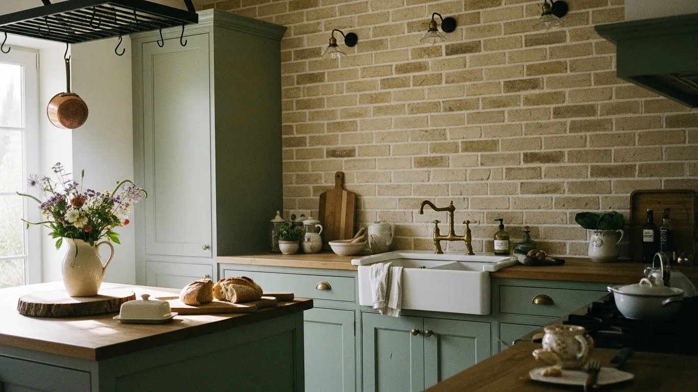 This kitchen feels like the kind of space where mornings are slow and sweet. The soft beige brick backsplash brings in a warm earthy texture that instantly makes the room feel grounded and welcoming. Paired with those lovely sage green cabinets and dark cup pulls, the whole setup gives off a perfectly balanced rustic yet polished vibe. The farmhouse sink, simple pendant lighting, and touches of natural wood around the room tie everything together in that cozy old-meets-new way. Even the sunlight hitting the brick adds its own little magic, almost like the room is showing off on purpose.