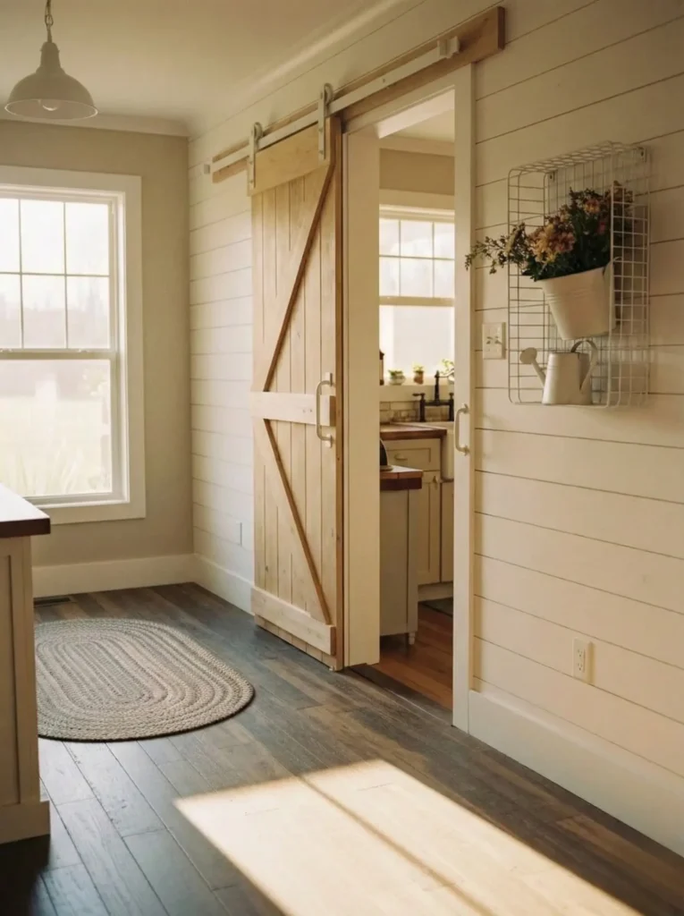 This cozy farmhouse moment highlights everything charming about country living. The weathered wood barn door instantly becomes the star of the space, adding texture and character against the soft cream shiplap walls. Natural light pours through the large windows and spills across the rich wood floors, creating a glow that feels effortlessly welcoming. Little touches like the braided rug, the black metal sconce, and the wire wall basket holding flowers bring in that perfect blend of rustic utility and sweet farmhouse personality. Even the peek into the adjoining kitchen hints at a home filled with warmth and thoughtful details.