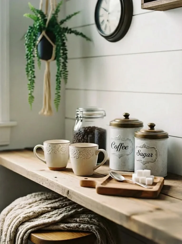 This sweet little corner feels like the kind of spot where mornings instantly get better. The warm wooden shelf creates a perfect landing place for charming farmhouse staples like vintage inspired coffee and sugar canisters, creamy patterned mugs, and a simple wooden tray filled with sugar cubes. Soft shiplap walls brighten the space while a hanging plant brings in that fresh, homey touch every cozy kitchen deserves. The knit throw draped casually over the stool adds an extra hint of comfort, making the whole setup feel wonderfully lived in without being cluttered.