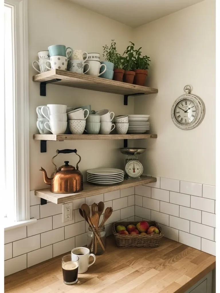 This cozy little corner feels like the heart of a lived in farmhouse kitchen. The warm wood shelves create the perfect spot for stacks of mismatched mugs in soft whites and gentle blues, giving the whole space a sweet collected over time feeling. The tiny terracotta pots packed with fresh herbs add a touch of life and just the right amount of rustic charm. A vintage style scale, a copper kettle, and basket of apples bring in those classic farmhouse textures that make the room feel homey. The white subway tiles and butcher block countertop keep everything clean and bright while still feeling warm and welcoming.