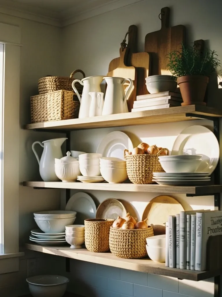 This cozy farmhouse kitchen idea celebrates the beauty of open shelving with a mix of white ceramics, natural woven baskets, warm wooden cutting boards, and a sweet little rosemary plant soaking up the sunlight. The simple palette of creams and honey-toned wood feels instantly calming, and the soft morning light makes everything look charming and lived in. I love how the shelves feel both organized and relaxed with stacks of bowls, plates tucked neatly behind baskets, and little touches of texture that add personality without clutter.