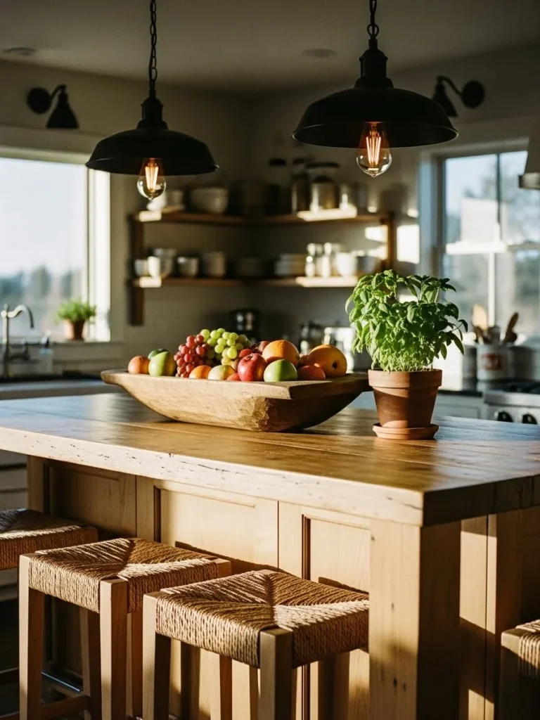 This cozy farmhouse kitchen brings together all the little touches that make a space feel instantly welcoming. The warm wood island sets the tone with its beautifully grained surface and slightly rustic edges that look like they’ve lived a few stories. Woven stools tuck neatly underneath, adding that irresistible cottage charm. Above the island, black pendant lights glow softly, giving the whole room a golden, late-afternoon warmth. Open shelves filled with everyday dishes keep things casual and homey, while a big wooden bowl overflowing with colorful fruit brings a cheerful, lived-in feel. The little pot of basil by the window makes the whole scene look like a fresh market morning right inside the kitchen.