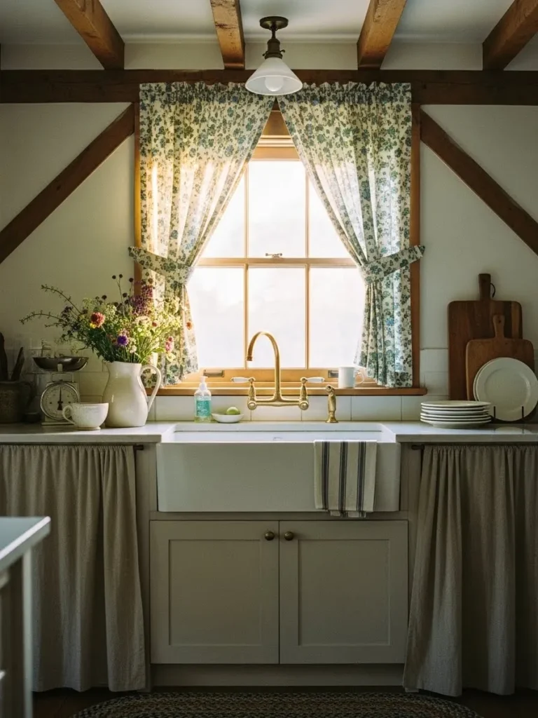 I adore this design because it feels like a gentle hug every time you look at it. There is something so soothing about those soft floral curtains catching the sunlight and the way the brass faucet glows in the warm light. It feels lived in and loved without trying too hard. Honestly, I could happily wash dishes here all afternoon with a cup of tea nearby. It’s cozy, feminine, and beautifully effortless in the best farmhouse way.