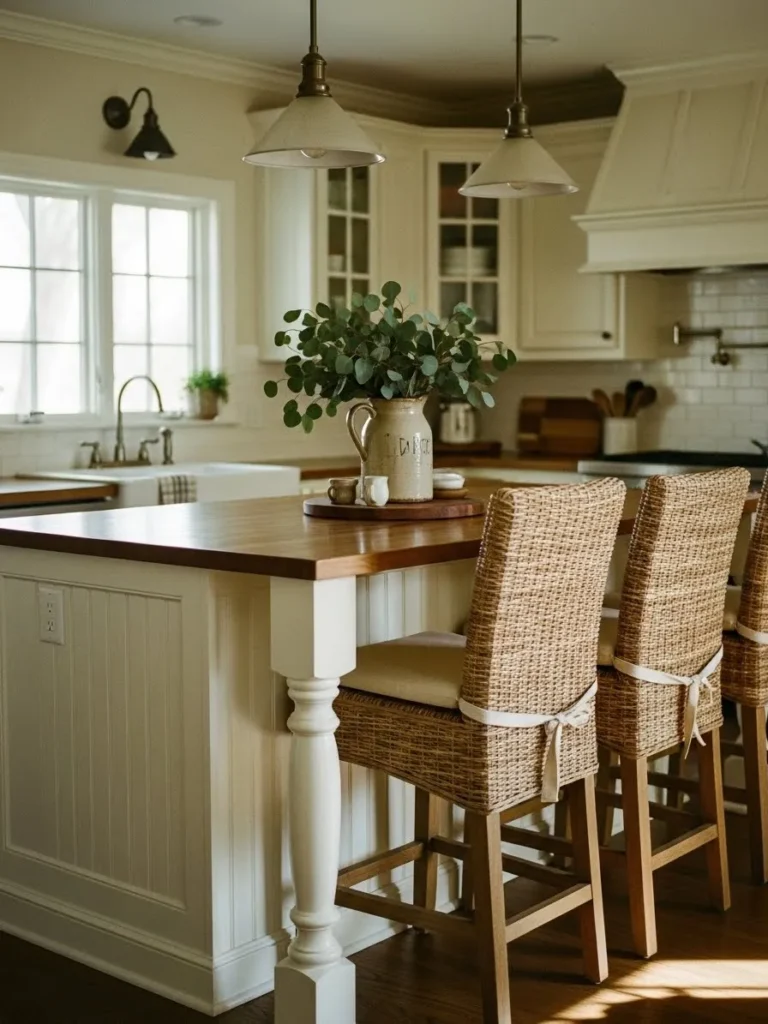 This kitchen has that effortless farmhouse charm that just feels instantly comforting. The creamy cabinetry, beadboard island, and warm wood countertop create a soft and welcoming backdrop, while the wicker barstools bring in that natural texture everyone secretly wants in their dream kitchen. The classic pendant lights add a lovely vintage glow, and the little touches like the ceramic jug filled with fresh greenery make the whole space feel lived in and loved. It is the kind of kitchen where slow mornings actually seem possible.