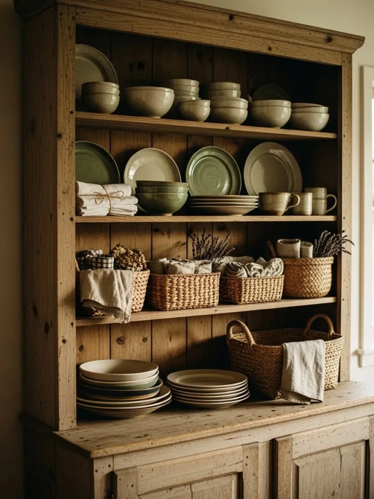 This cozy farmhouse kitchen moment features a beautifully weathered wooden hutch filled with the sweetest mix of neutral ceramics, soft linens, and woven baskets. The open shelving creates that effortless lived-in look we all love, with stacks of plates and bowls in creamy whites and muted greens that feel earthy and calming. The wicker baskets add warmth and texture while keeping everything looking tidy, and the natural grain of the wood brings that authentic rustic charm you simply cannot fake. It feels like the kind of space where every piece has a purpose and a story.