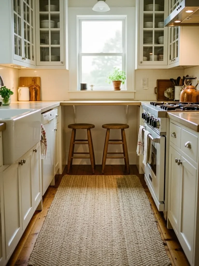 This sweet little farmhouse kitchen feels like the kind of space where mornings just naturally start slow and cozy. The tall window pulls in the prettiest soft daylight and instantly makes the narrow layout feel more open and breezy. I love how the built in counter under the window creates a charming breakfast nook with two simple wooden stools that look perfectly worn in. The creamy cabinetry, glass front uppers, warm butcher block accents, and that long textured runner all work together to bring in so much warmth. Even the tiny details like the copper kettle, potted herbs, and neatly stacked dishes give the room a lived in charm that feels both tidy and welcoming.