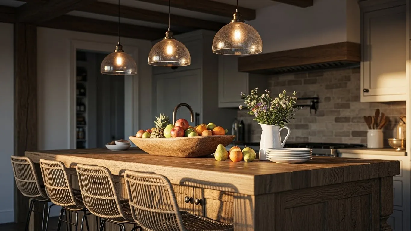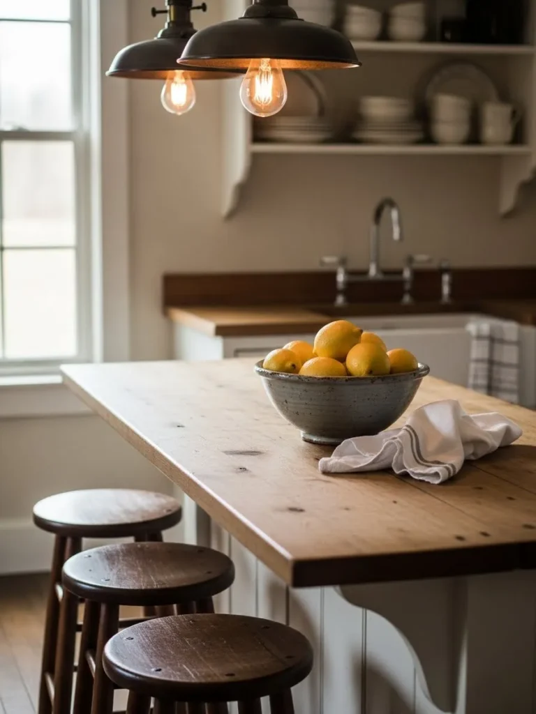 This cozy farmhouse kitchen brings together all the little details that make a space feel instantly welcoming. The warm wood island takes center stage with its natural grain and soft imperfections that give it so much personality. A simple ceramic bowl of lemons adds a bright pop of color without trying too hard, while the striped kitchen towel draped casually over the edge makes the whole scene feel lived in. The trio of rustic wooden stools tucks neatly beneath the counter and the open shelving in the background keeps everything airy and relaxed. Soft light from the vintage pendant bulbs creates a glow that makes the room feel warm even on a gray morning.