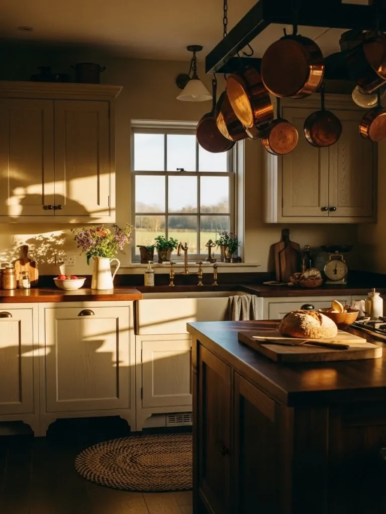 This warm farmhouse kitchen feels like it was designed to catch every last drop of golden afternoon sunlight. Soft cream cabinetry pairs with rich wood countertops, creating a mellow contrast that feels instantly comforting. The apron front sink sits right beneath a picture window that frames a peaceful countryside view, and the brass fixtures add a lovely touch of old fashioned charm. Overhead, the copper pots catch the light in the prettiest way, giving the whole space a lived in, well loved feel. The island at the center anchors the room with deeper wood tones and a loaf of fresh bread waiting to be sliced, making the space feel welcoming and effortlessly homey.