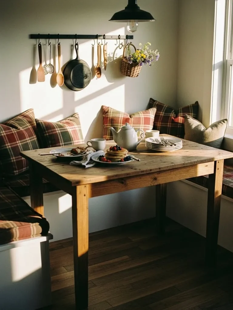 This sweet little farmhouse nook feels like the kind of place where mornings magically slow down. The warm sunlight pours through the window and lands on a rustic wooden table that looks lovingly worn in the best way. Plaid cushions line the built-in benches and instantly make the whole corner feel softer and more welcoming. I love how the wall hooks display wooden spoons and a cast iron pan like charming decor while still being totally practical. The tiny woven basket filled with fresh flowers is such a simple touch but makes the space feel alive and homey.