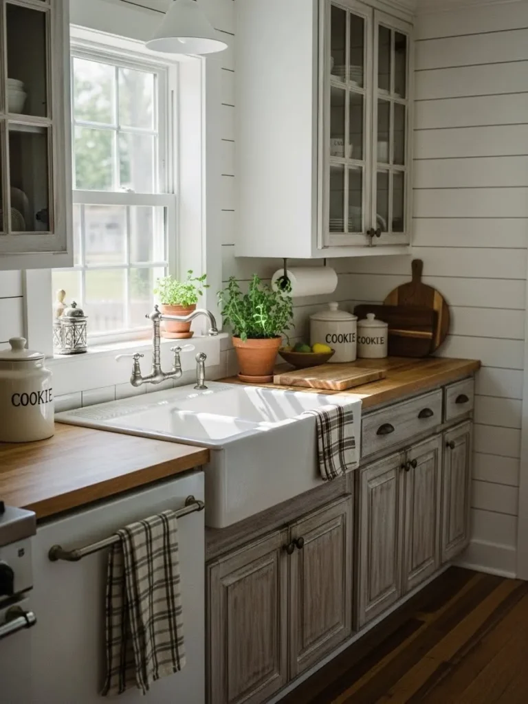 This sweet farmhouse kitchen feels like the kind of space where sunlight lingers on purpose. The bright white apron sink takes center stage with its classic cottage charm, paired beautifully with warm wooden countertops that add a soft rustic touch. Lightly weathered cabinets create that perfectly lived-in feel without ever looking tired. The shiplap walls keep everything airy and crisp while the little lineup of potted herbs brings in a breath of fresh green. Glass-front upper cabinets, a pair of cookie jars, and a few wooden boards finish the look with simple cozy character.