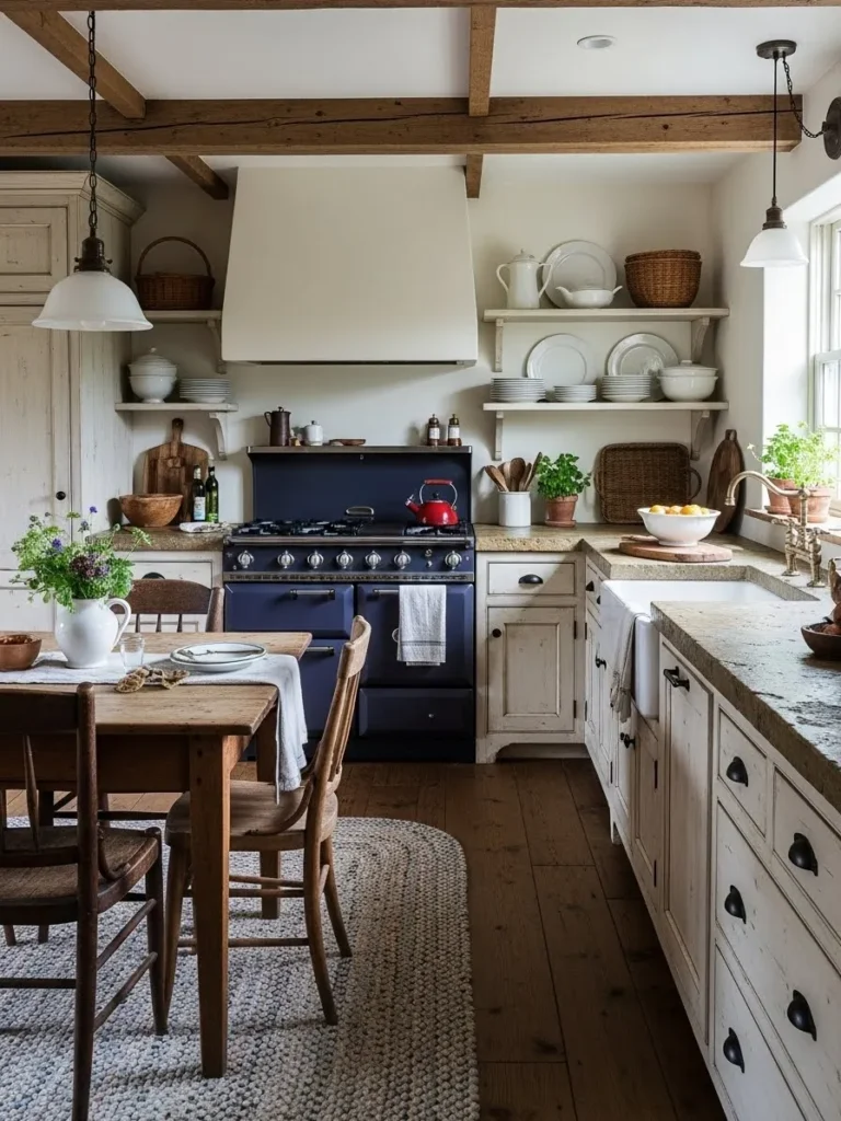 This cozy farmhouse kitchen brings together all the things that make a space feel lived in and loved. The creamy white cabinetry has that soft, timeworn look that makes the whole room feel instantly welcoming. The open shelving filled with simple white dishes adds a sweet touch of everyday charm while the woven baskets and fresh greenery keep everything feeling natural and homey. I adore how the deep navy stove becomes the star of the room without feeling too bold. The weathered wood floors, exposed ceiling beams, and that braided rug under the table all work together to create a warm and grounded atmosphere. It feels like the kind of kitchen where someone is always baking something and the kettle is permanently on.