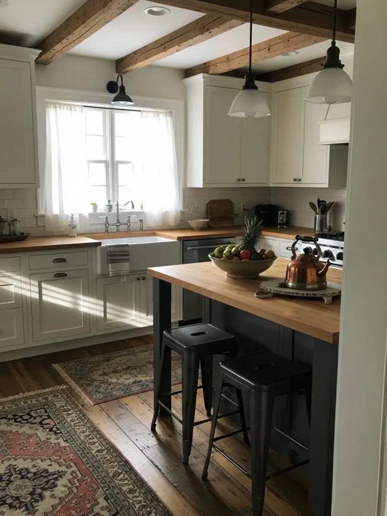 This cozy farmhouse kitchen blends bright white cabinetry with warm wood counters that feel instantly welcoming. The natural light pouring through the soft sheer curtains gives the space an airy glow that balances beautifully with the rustic exposed ceiling beams. The butcher block island adds a functional and charming focal point, paired with dark metal stools that bring in a subtle industrial touch. Vintage style rugs soften the wood floors and make the whole kitchen feel lived in and loved, while classic farmhouse elements like the apron front sink and copper kettle complete the warm and homey vibe.