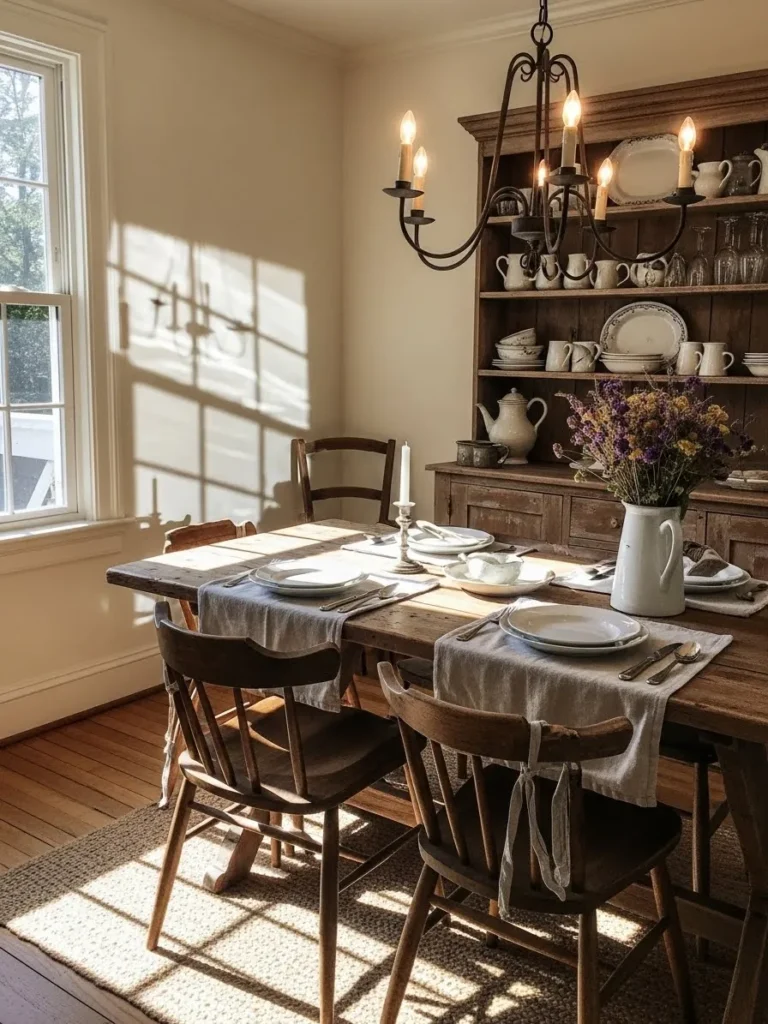 This charming farmhouse dining nook feels like the kind of space where mornings always start slow and sweet. Warm sunlight pours through the window and casts the prettiest shadows across the room. The wooden table has that perfectly weathered look that only gets better with age and pairs beautifully with the classic spindle-back chairs. Soft linen runners add a relaxed texture while simple white dinnerware keeps everything feeling airy and uncluttered. The vintage hutch in the background is filled with stacked plates and collected pottery that give the entire room a lived-in storybook charm. The iron chandelier brings in a gentle glow that makes the room feel cozy any time of day.