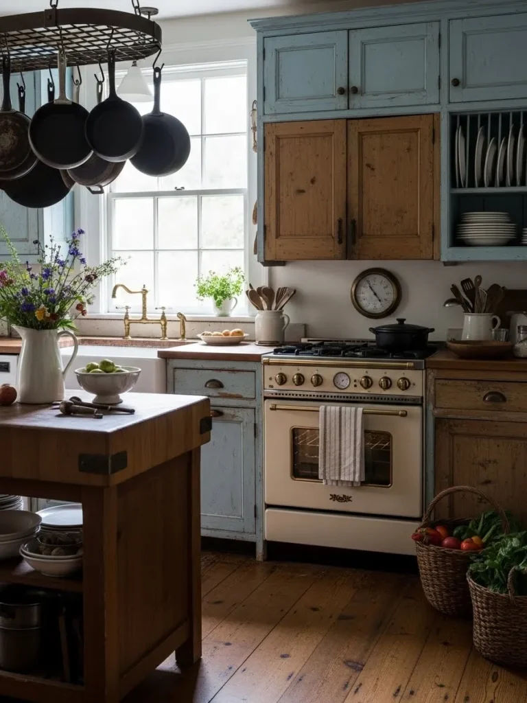 This cozy kitchen blends soft blue and warm natural wood in the sweetest way with cabinets that look lovingly aged and full of character. The vintage style cream stove instantly becomes the heart of the room and the worn butcher block island adds that perfect touch of country practicality. Sunlight filters through a wide farmhouse window that frames the brass faucet and a little pot of greenery. Open shelving and a hanging pot rack make the space feel lived in and effortless. The whole room has this gentle mix of rustic textures and simple charm that feels like it has been cherished for years.