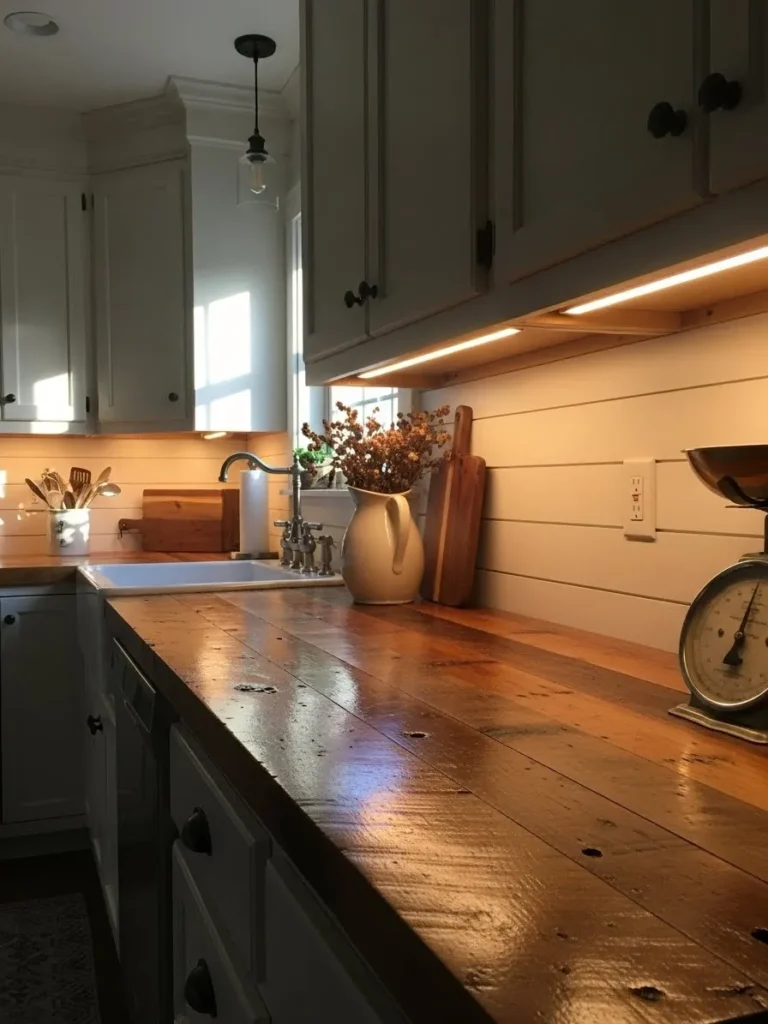This cozy farmhouse kitchen feels instantly welcoming thanks to its rich wood countertops that catch the afternoon light in the prettiest way. The creamy white cabinets pair beautifully with the honey toned counter surface and the soft under cabinet lighting adds that gentle glow we all secretly want in our kitchens. Shiplap walls bring in that classic country charm while simple accents like a vintage scale, dried florals, and well loved cutting boards add so much personality. The whole space feels lived in yet thoughtfully styled with natural textures and warm colors that make you want to linger a little longer.