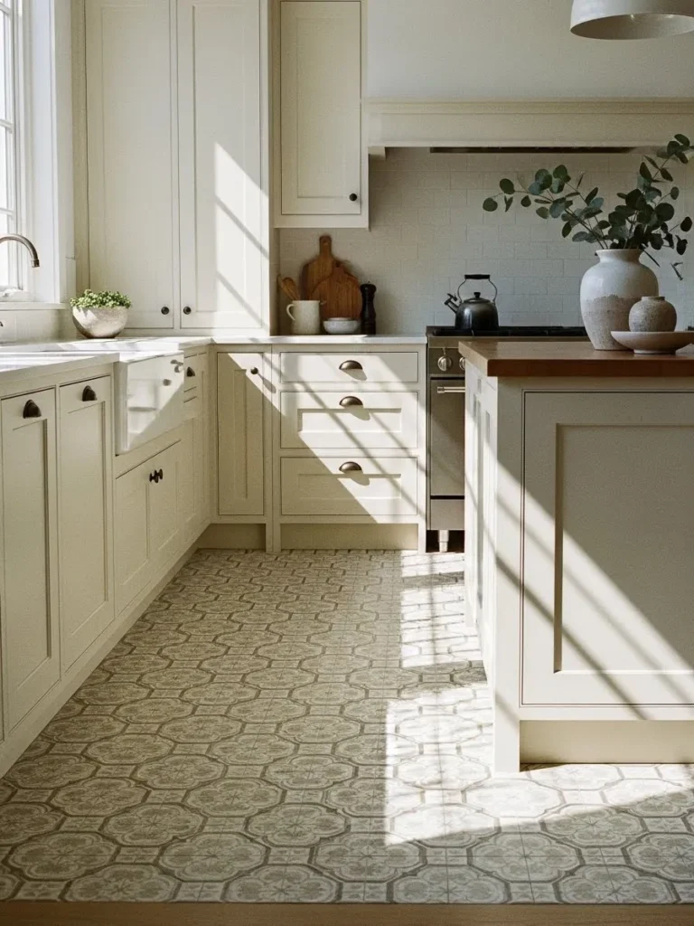 I find this design so lovely because it has that quiet kind of elegance that doesn’t try too hard. The moment the sunlight stretches across those cream cabinets it feels like the kitchen is giving you a warm little hug. I’m especially smitten with the patterned floor because it adds character without stealing the show. It is the kind of space that makes everyday moments feel softer which is exactly what I adore in a kitchen.