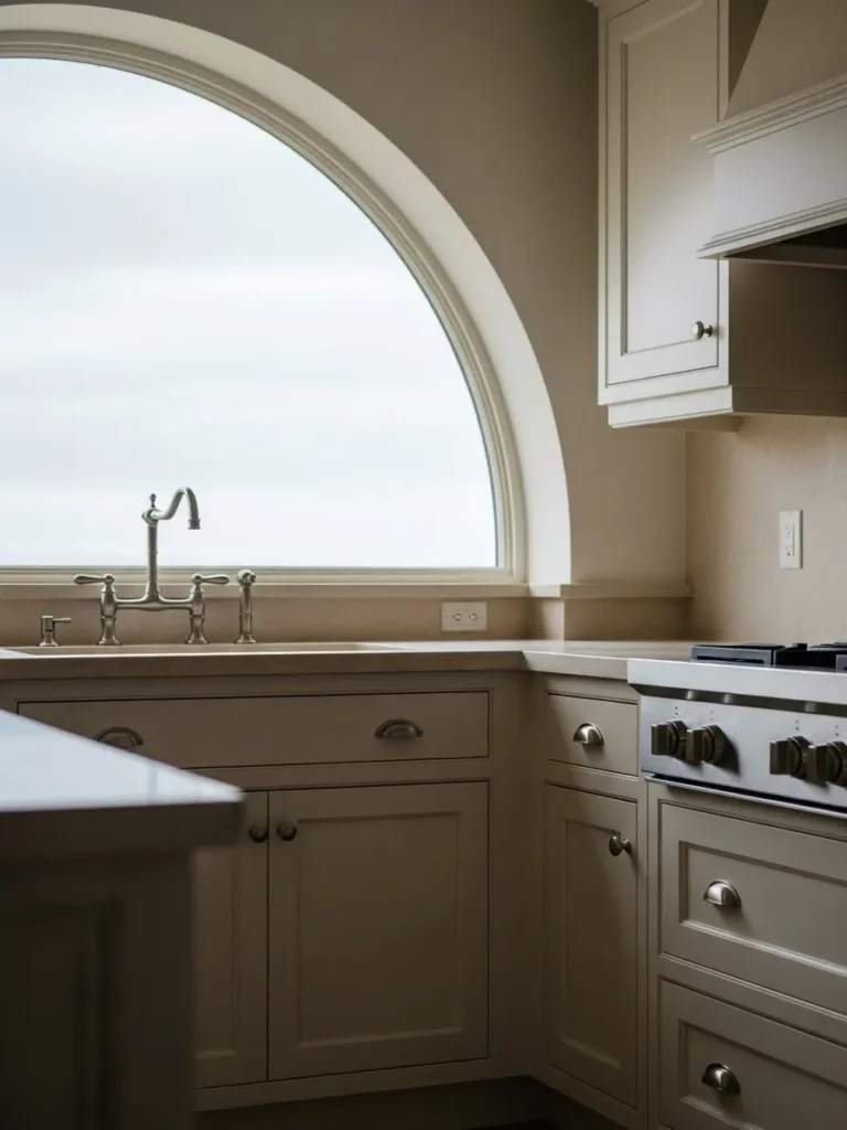 This kitchen feels wonderfully serene with its soft cream cabinets wrapping gently around the room and drawing your eye straight to that gorgeous arched window. The muted tones create a calm backdrop while the classic hardware gives everything a touch of quiet charm. I love how the natural light pours through the window and brightens the countertops and sink area. The entire space feels warm and soothing without trying too hard and it has that timeless quality that never goes out of style.