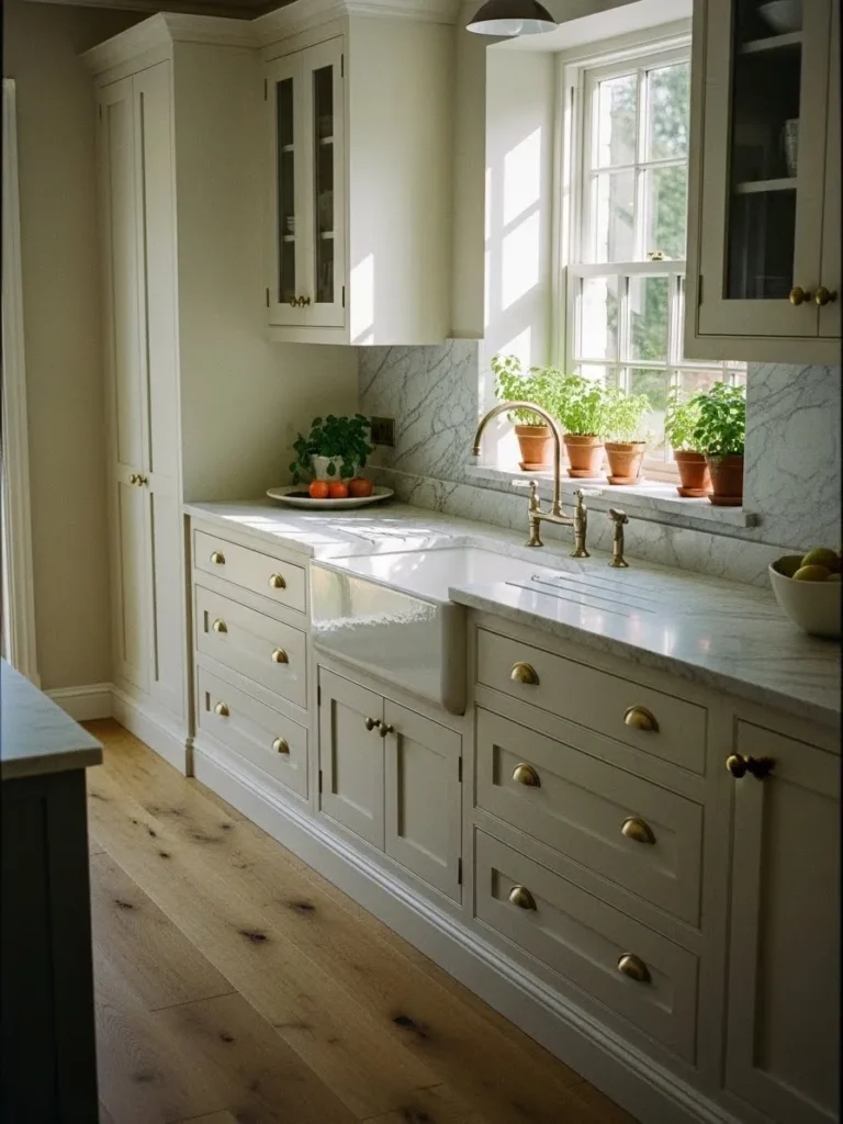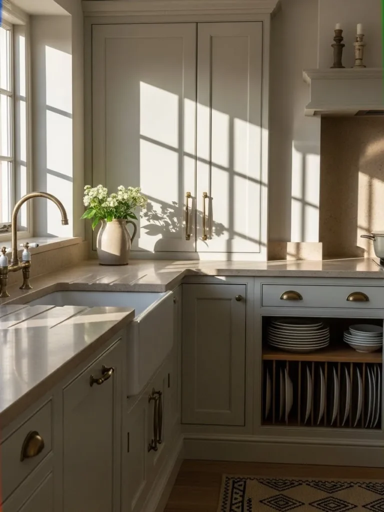 This kitchen feels instantly soothing with its soft cream cabinetry glowing in the afternoon sunlight. The shaker style doors, brass hardware, and classic farmhouse sink create a look that feels both timeless and lived in. I love how the natural light pours across the counters and highlights every gentle curve and detail. The built in plate rack adds such a charming, practical touch and the simple stone countertops keep everything feeling airy and effortless.