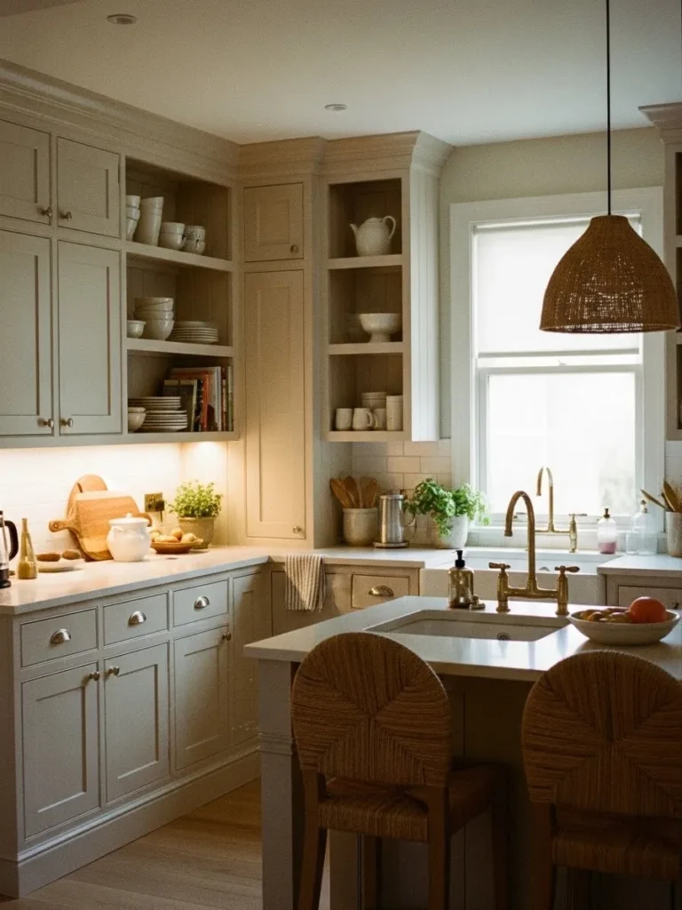 This kitchen brings together soft cream cabinetry and woven natural textures in a way that instantly feels warm and lived in. The shaker cabinets create a clean and timeless base while the open shelves add a relaxed and welcoming touch with neatly stacked dishes and pretty ceramics. I love how the warm brass hardware and faucet soften the room even more and pull in the gentle glow from the wicker pendant. The light wood floors and woven counter stools give everything a subtle earthy balance. It all feels calm comfortable and beautifully curated without trying too hard.