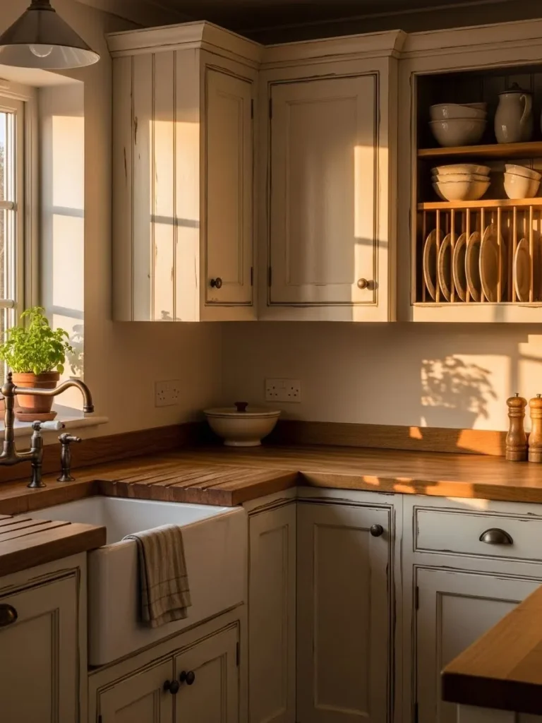 This cozy cottage kitchen feels instantly welcoming thanks to its beautifully distressed cream cabinets and the way the late afternoon sunlight drapes across every surface. The farmhouse sink adds that classic country appeal, while the wooden countertops bring in a warm, natural texture that makes the space feel grounded and lived in. I love how the open plate rack shows off simple stoneware pieces, giving the room an easygoing, collected look. Even the vintage style hardware and the little potted herb by the window add to the charm, making the whole space feel thoughtfully loved rather than overly styled.