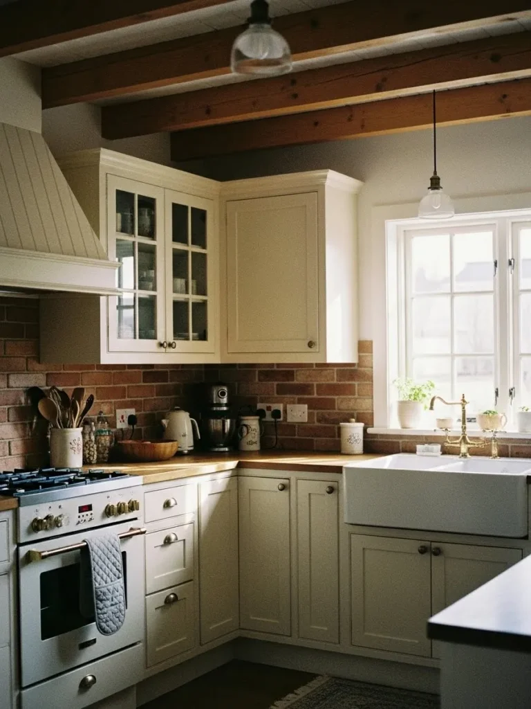 I think this design is so lovely because it strikes that perfect balance between rustic character and soft elegance. The warm light hitting those cream cabinets feels like a quiet little moment at the end of a long day, and it makes the whole kitchen feel like a gentle hug. I can easily imagine brewing a cup of tea here while the sun sets, and honestly that alone makes it feel beautifully inviting.