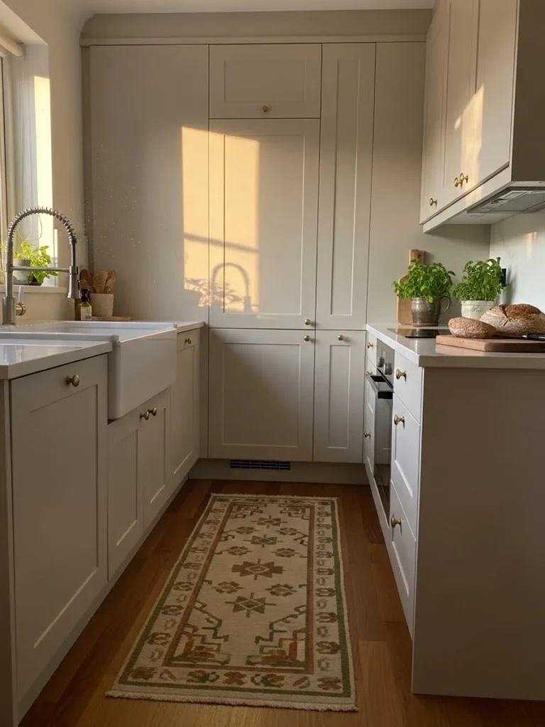 This charming kitchen pairs soft cream cabinets with warm afternoon light that makes the whole space feel peaceful and cozy. The shaker cabinetry keeps everything classic and simple while the brass knobs add a sweet little sparkle. A farmhouse sink sits beneath a sunny window that brings in the prettiest natural glow. The runner on the floor adds just enough pattern to keep things interesting while the wood floors ground the whole room with warmth. It feels compact in the best way since every detail has its place without looking crowded.