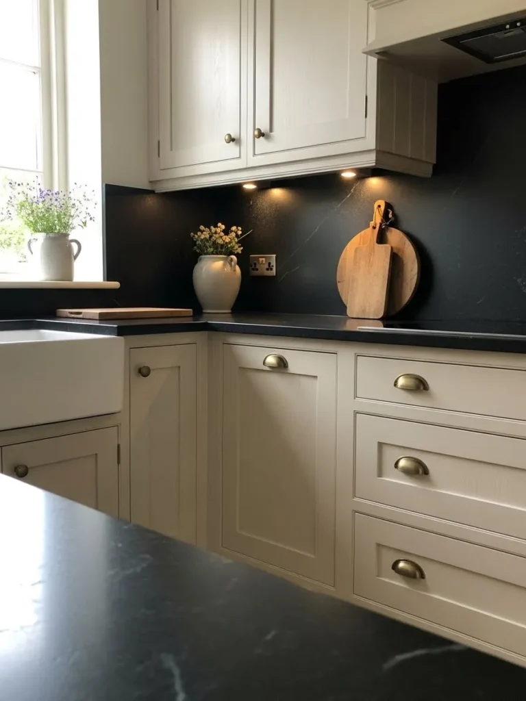 This kitchen brings together the sweetest blend of traditional charm and modern simplicity. The cream shaker cabinets feel warm and calming against the deep charcoal backsplash, and the soft under cabinet lighting adds such a cozy glow. I love how the brass cup pulls give the drawers a gentle vintage touch. The farmhouse sink, the round wooden boards, and the little vases of flowers make the whole corner feel relaxed and lived in. It is the kind of space that looks beautiful without trying too hard.