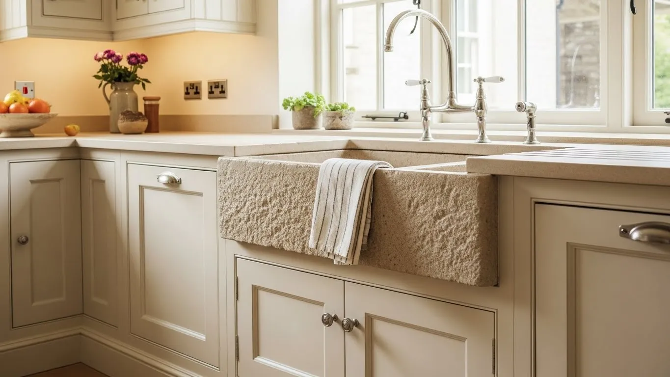 I think this design is so lovely because it strikes that perfect balance between rustic character and soft elegance. The warm light hitting those cream cabinets feels like a quiet little moment at the end of a long day, and it makes the whole kitchen feel like a gentle hug. I can easily imagine brewing a cup of tea here while the sun sets, and honestly that alone makes it feel beautifully inviting.