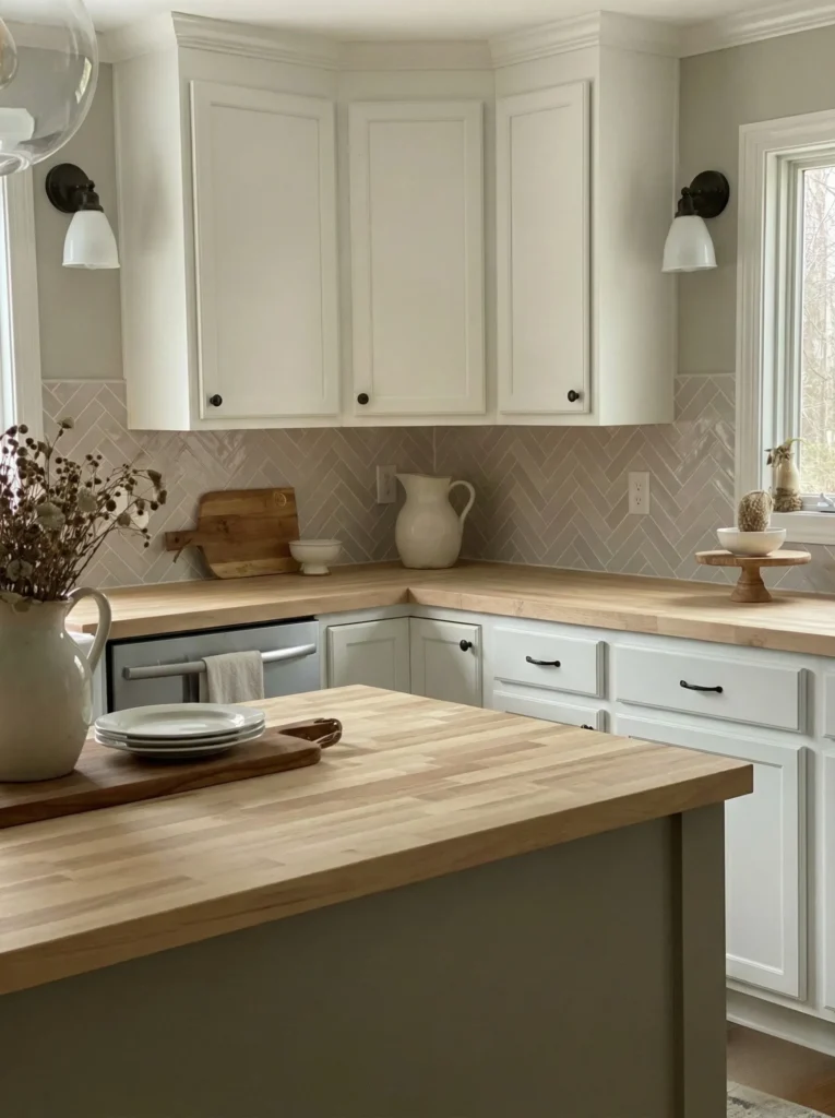 This kitchen brings together the sweetest blend of soft neutrals and classic farmhouse warmth. The creamy white cabinets feel bright and calm while the light wood countertops add that gentle touch of rustic comfort that farmhouse lovers always gravitate toward. The herringbone backsplash ties everything together in such a graceful way with its subtle beige tone and pretty pattern that feels refined without trying too hard. The dark knobs and handles add the perfect little pop against all the softness and the simple styling with cutting boards and pottery keeps the space feeling relaxed and lived in.