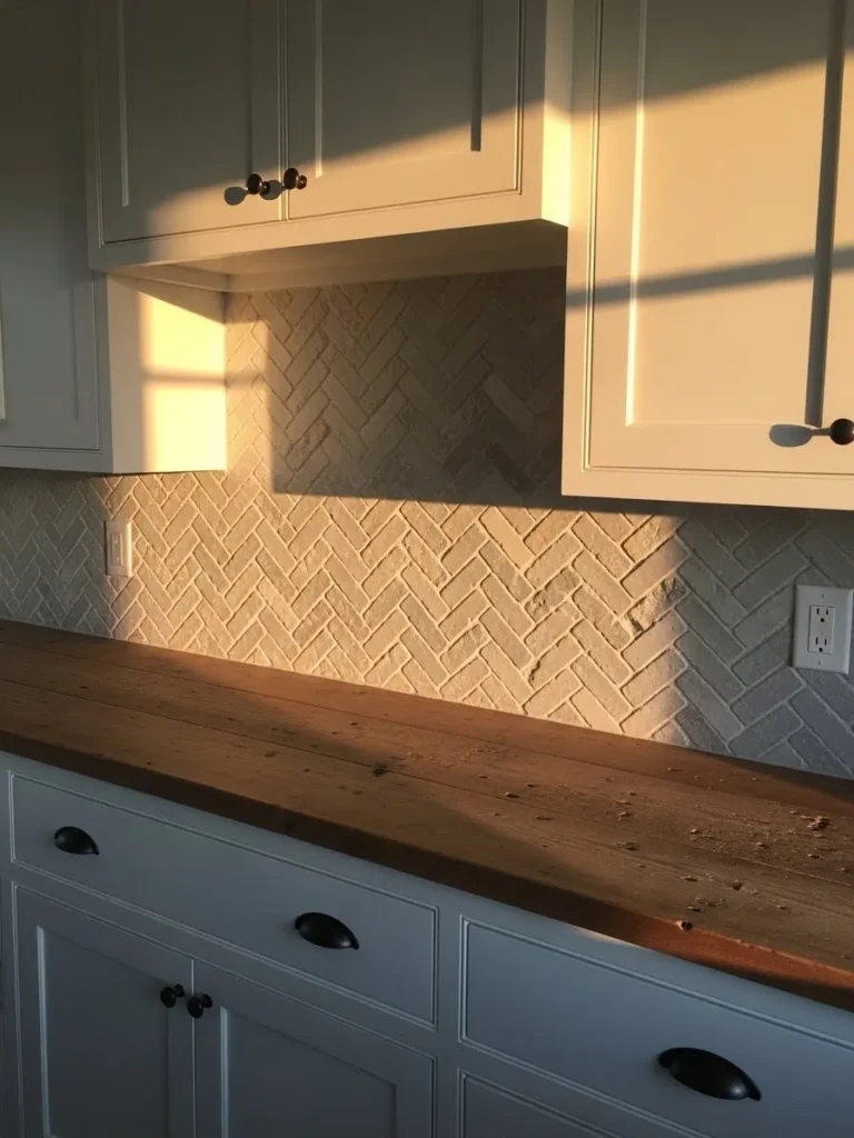 This farmhouse kitchen features a lovely herringbone tile backsplash that adds quiet texture without overwhelming the space. The tiles have a soft, chalky tone that feels warm and natural, especially when the evening sun hits them. Paired with classic white cabinetry and a rustic wood countertop full of character marks, the whole setup feels thoughtfully layered. The contrast between the smooth cabinets and the weathered wood creates that perfect balance of polished and lived-in that so many farmhouse kitchens aim for.