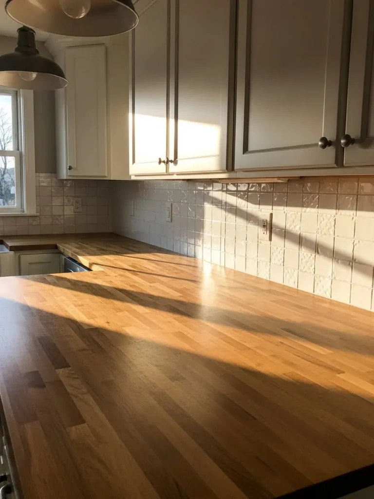 I love how the sunlight moves across the backsplash and brings out every little ridge in the tile. It feels calm and cozy at the same time. The warm glow against the wood countertop makes the whole space look like a moment you want to stop and admire. There is something so simple yet so beautiful about materials that look like they have a story to tell.