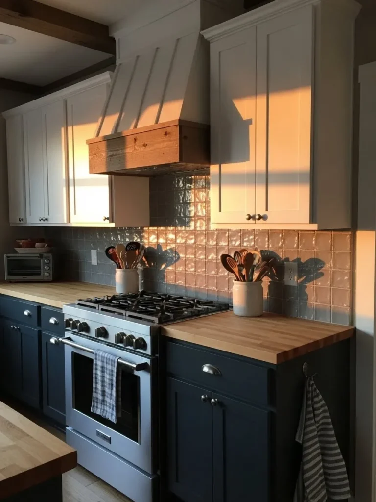 This farmhouse kitchen features a glossy square tile backsplash that catches the evening light in the prettiest way. The soft reflective surface adds a gentle sparkle that plays so well with the warm wood countertops and the deep navy lower cabinets. The white upper cabinets and the custom hood bring in that classic farmhouse charm, while the natural wood trim on the hood adds a cozy rustic touch. Everything feels thoughtfully balanced and wonderfully homey.