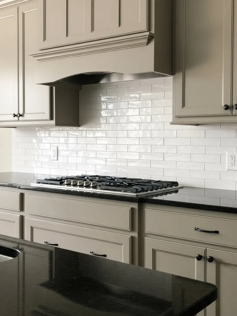 This kitchen pairs soft taupe cabinetry with a glossy white subway tile backsplash that feels clean and timeless. The tiles are stacked in a simple pattern that keeps the whole space looking neat and bright, and the shine from the glaze adds a gentle sparkle when the light hits it. The dark countertops bring in a bold contrast that makes the backsplash stand out even more, giving the whole kitchen a balanced look that feels both polished and cozy.