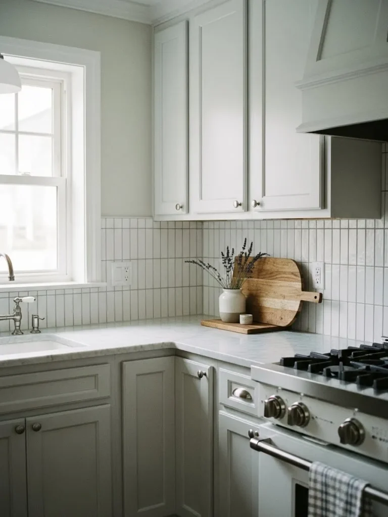 This kitchen brings a gentle and calming farmhouse feel with its soft vertical tile backsplash that instantly adds height and elegance to the space. The cabinets are painted in a muted light gray that feels airy and timeless, while the marble style countertops keep everything fresh and bright. The slim vertical tiles line the wall in a clean rhythm that feels both classic and a little modern. A simple ceramic vase with sprigs of lavender sits next to a warm wooden cutting board, giving the whole corner that pretty mix of rustic and refined. Natural light pours in from the window and makes every detail feel even softer.