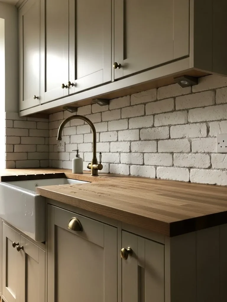 This kitchen brings together the prettiest mix of soft neutrals and rustic texture. The painted brick backsplash steals the show with its cozy handmade feel and slightly worn surface that adds so much character. The wooden countertops warm up the whole space and play beautifully with the creamy cabinetry. The brass faucet and hardware sparkle just enough to make everything feel thoughtfully put together without being flashy. It is the kind of design that feels calm and grounded from the moment you step in.