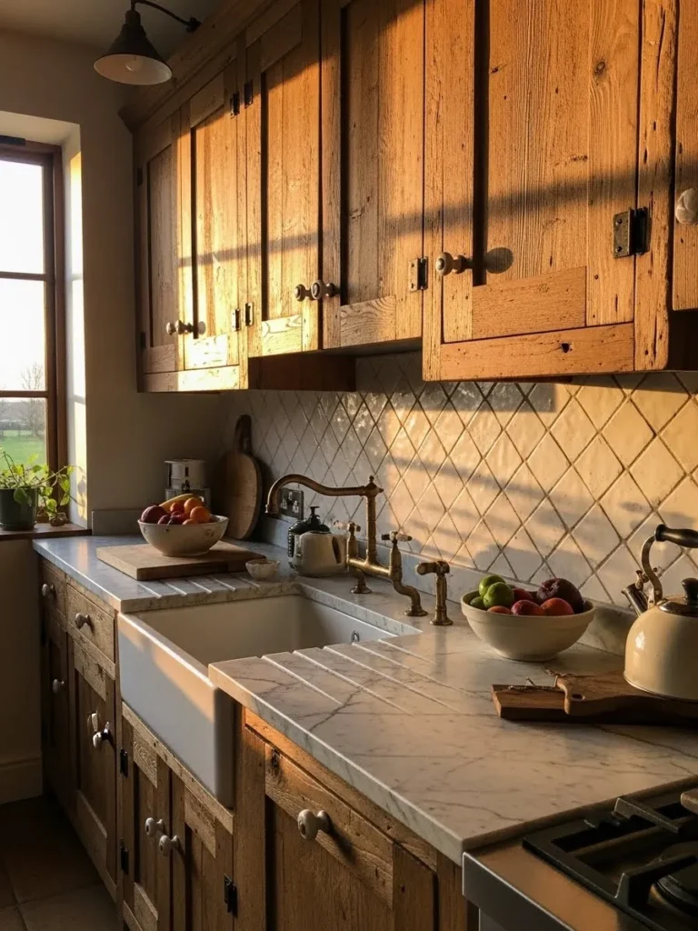 This kitchen brings together the coziest parts of farmhouse style in the prettiest way. The warm wood cabinets feel rich and natural with all their charming knots and texture. The soft cream backsplash has a gentle diamond pattern that adds interest without stealing the show. The marble countertops brighten the space and balance the rustic mood with a smooth, elegant touch. The brass fixtures pull everything together and look especially lovely with the sunlight pouring through the window.