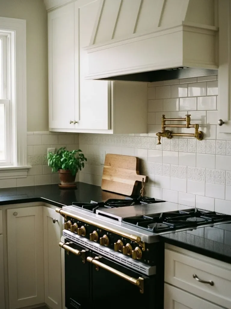 This kitchen pairs crisp white cabinetry with a timeless subway tile backsplash that feels clean and calming. The tiles have a soft sheen that catches the light and the subtle patterned border running through the center adds a touch of sweetness without stealing attention. The black range anchors the space with its vintage charm while the warm brass hardware gives the whole room a gentle glow. Everything feels intentional from the pot filler to the pretty little cutting board leaning in the corner.