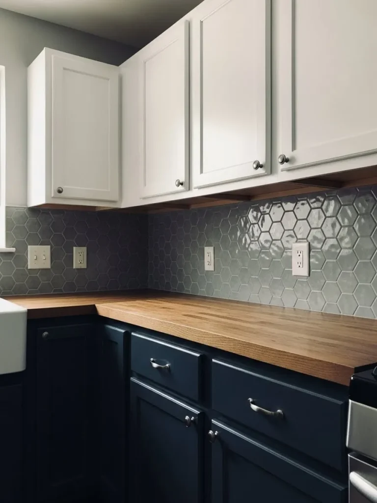 This kitchen brings together a soothing mix of textures and tones that feels quietly stylish in the best farmhouse way. The glossy gray hexagon backsplash adds a soft shimmer that catches the light without feeling flashy. Paired with the crisp white upper cabinets and the deep navy lowers, the whole space has a balanced and grounded look. The warm butcher block countertops add that natural touch that makes everything feel inviting. It is simple, clean, and charming in that effortless way we all wish our kitchens looked on a random Tuesday.