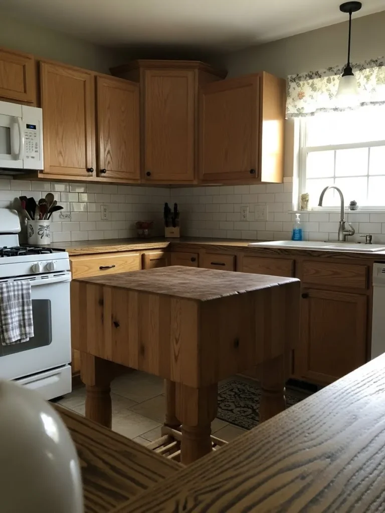 This kitchen brings together timeless farmhouse charm with its warm honey toned wood cabinets and clean white subway tile backsplash. The tilework adds a crisp backdrop that brightens the space, while the natural wood tones create a cozy and welcoming atmosphere. The chunky butcher block island adds a sturdy focal point that feels both practical and full of character. Soft daylight from the window keeps everything feeling fresh and lived in. The whole room gives off that comfortable country feeling without trying too hard.