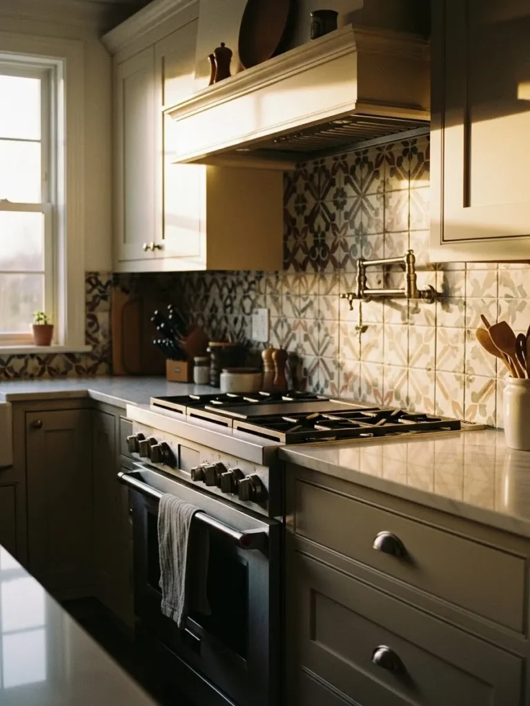 I love how this backsplash feels both simple and special at the same time. Those patterned tiles make me smile because they feel like tiny pieces of art without overwhelming the space. The whole look feels calm yet interesting and it is exactly the kind of design that makes me want to spend an afternoon baking something sweet while music plays in the