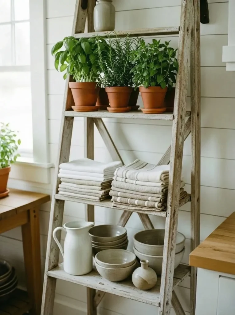 This charming setup turns a weathered wooden ladder into the prettiest little farmhouse display. Each shelf is styled with a mix of fresh potted herbs, neatly folded neutral linens, and simple stoneware pieces. The worn whitewashed wood gives everything that softly aged look that feels cozy and lived in. The terracotta pots add warm color while the herbs bring in that just picked freshness that instantly brightens a kitchen. The whole arrangement feels effortless, natural, and wonderfully homey.