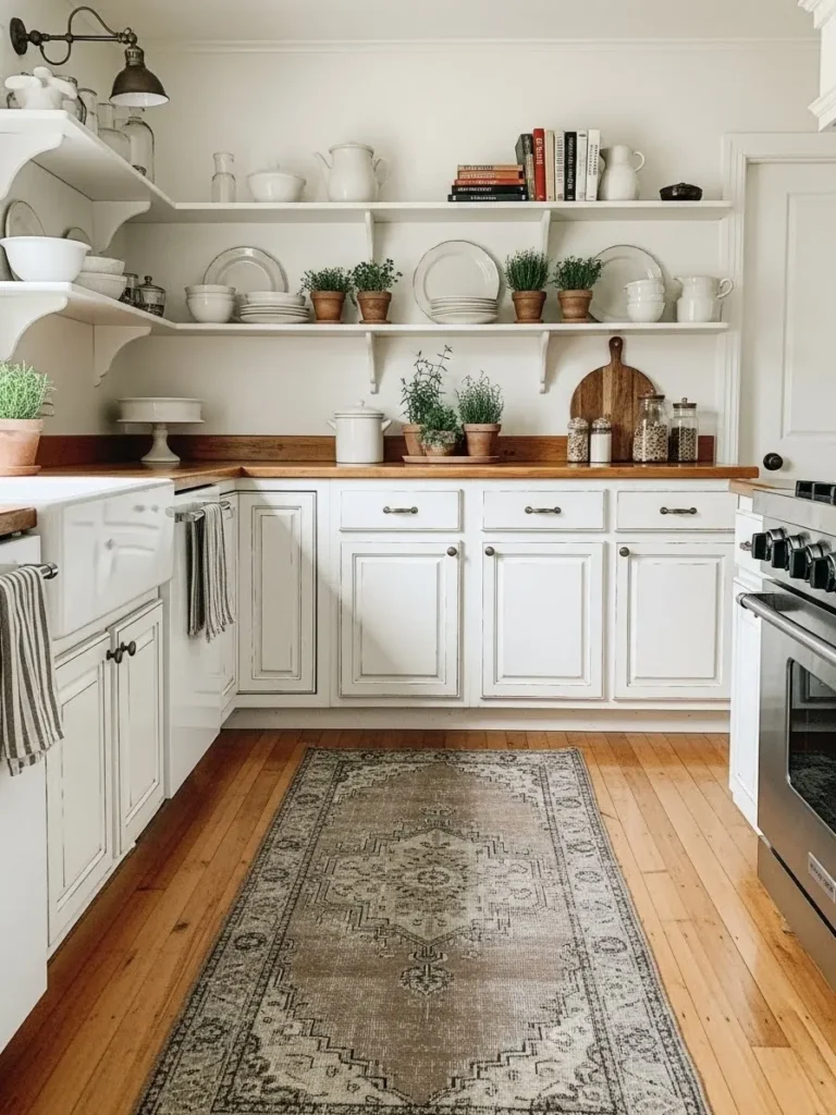 This cozy farmhouse kitchen brings together charming open shelving, warm wood countertops, and crisp white cabinetry for a look that feels both classic and effortlessly chic. The arrangement of white dishes, clear glass pieces, and rustic terracotta pots creates a simple yet curated display that feels lived in without feeling cluttered. The runner on the floor adds a soft touch and pulls the whole space together with its earthy pattern. Everything feels warm, airy, and perfectly balanced against the natural wood floors.
