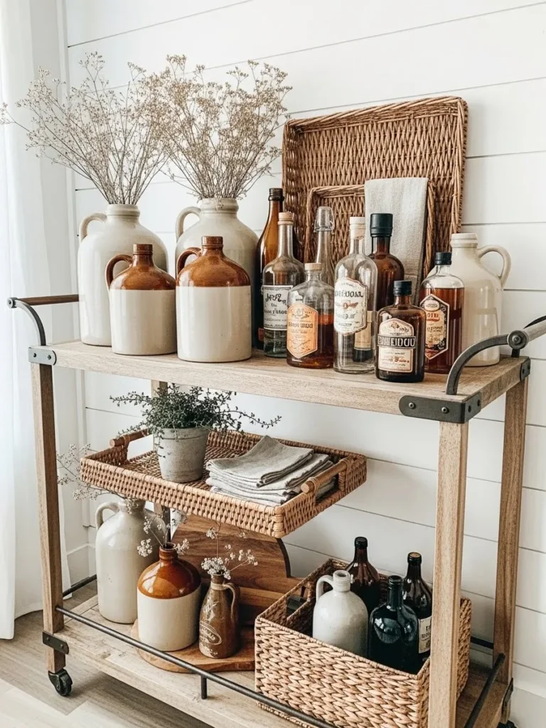 This charming farmhouse setup turns a simple bar cart into a little moment of rustic magic. The mix of stoneware jugs, amber bottles, wicker trays and soft neutral linens creates that warm lived in feeling we all secretly want our kitchens to have. I love how the dried florals add height and texture while the baskets keep everything feeling organized without trying too hard. The natural wood tones pair beautifully with the creamy ceramics and the whole look feels collected over time in the sweetest way.